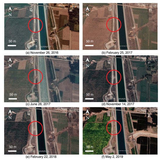 The Google satellite map is inspected to investigate the land surface of this region, and its archived images spanning from 26 November, 2016 to May 2, 2019 are shown in Figure 5. Comparing these images reveals an obvious land collapse in the region denoted by red circles. In Figure 5a,b, this region remained intact, while an apparent damaged area can be observed in Figure 5c,d. This damage seems to be repaired with side slope tactionion tools in Figure 5e, and fully repaired in Figure 5f. This region is about 60 m south of the P1 region along the western embankment. Considering that the temporal coverage of the RSAT2 dataset is from 4 April 2015 to 5 March 2016, and the S1A temporal coverage is from 17 June 2015 to 31 May 2016, the large deformation rate at P1 in Figure 4 should have indicated the deforming process underground before the collapse occurred on the land surface.