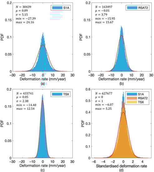 Histograms showing the deformation rate distributions of (a) S1A, (b) RSAT2, and (c) TSX results (units for and are mm/year), as well as (d) the distributions of the standardised deformation rates of the three results. The red curves in (a–c) are fitted normal distributions for the three results, respectively. The red curve in (d) is the fitted normal distribution for the standardised and combined deformation rates.