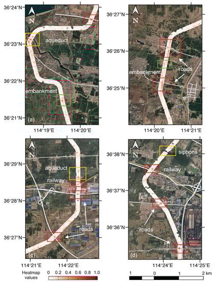 With the standardised and combined deformation rates, the stability of the SNWD-CR is evaluated using a MAD-based weighted heatmap, as shown in Figure 11. Heatmaps of four segments of the central route are presented in Figure 11a–d. The weighted heatmap reflects not only the density of the risky points but also the significance of the risk. The higher the heatmap value, the higher the risk. The white and yellow lines seen on the Google satellite map are roads and railways, respectively. Apart from the two regions located at the canal embankments denoted by green boxes, most risky regions are associated with roads and railways, as denoted by the red boxes. In addition, aqueducts and siphons are other ancillary facilities at high risk of deformation.