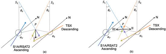 It is worthwhile noting that heading angles of the SAR systems largely influence the results, including not only the number of selected PS points, as mentioned in the previous sections, but also the measured deformation direction. Figure 12a,b illustrate three cases (I, II, and III) of measured deformation by S1A/RSAT2 and TSX. In case I, shown in Figure 12a, there is a dominant downward deformation, and the measured deformation is negative for both ascending and descending orbits. The situation is different for cases II and III, shown in Figure 12b, in which the planar movement is dominant. In case II, the measured deformation is positive for the descending orbit and negative for the ascending orbit when the actual deformation occurs in the east direction. In case III, with a westward deformation, the signs of the measured deformation become opposite to those in case II.