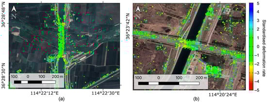 The standardised deformation rates of the merged result of (a) the aqueduct and (b) the crossing-canal bridge.