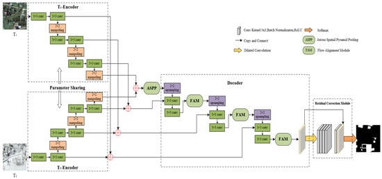 The proposed Siam-FAUnet model is illustrated in Figure 1, and comprises two parts, namely the prediction module and the residual correction module. The prediction module, which is composed of an encoder and a decoder, receives remote sensing images from two different temporal periods (T1 and T2). Combine the atrous spatial pyramid pooling (ASPP) and the flow alignment module (FAM) in this module, the network uses image information to perform multiple consecutive convolutions and the deconvolution operations to extract deep and multi-scale feature information, thus allowing for the prediction of changing areas. The residual correction module is used to reduce the residual between the prediction and the ground truth, thereby enhancing the accuracy of change detection and producing more accurate change binary maps.