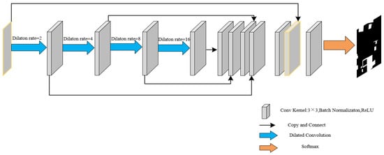 The structure of the dilated convolution residual correction module is shown in Figure 4. The proposed dilated convolution residual correction module features a structure with four convolutional layers of varying dilation rates, with the dilation rates being 2, 4, 8, and 16, and the number of dilated convolution kernels being 32. This module fuses the feature maps of different receptive fields through superposition, with each convolutional layer being followed by batch normalization and ReLU activation functions. The input of this module contains the initial information of image prediction, and adding and fusing the input image with the obtained feature map results in more detailed change information. The final modified change detection image is then obtained through the use of the Softmax function to classify changed and non-changed pixels.