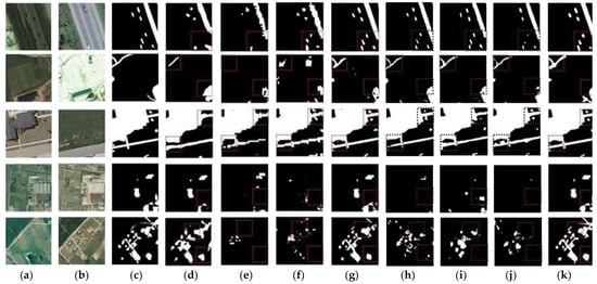 Figure 10. Example of change detection visualization results of different models: (a,b) are original bi-temporal images; (c) is the ground truth; (d) is the result of CDNet; (e) is the result of FC-Siam-conc; (f) is the result of FC-Siam-diff; (g) is the result of IFN; (h) is the result of DASNet; (i) is the result of STANet; (j) is the result of SNUNet; and (k) is our result of Siam-FAUnet.