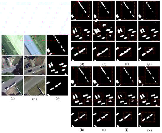 Figure 9. Example of change detection visualization results of different models: (a,b) are original bi-temporal images; (c) is the ground truth; (d) is the result of CDNet; (e) is the result of FC-Siam-conc; (f) is the result of FC-Siam-diff; (g) is the result of IFN; (h) is the result of DASNet; (i) is the result of STANet; (j) is the result of SNUNet; and (k) is our result of Siam-FAUnet.
