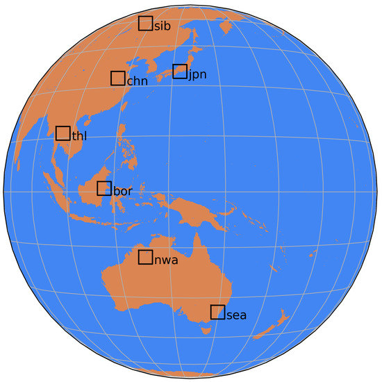To facilitate the study, a number of 200 × 200 pixel case study areas were identified across the AHI full disk, which are detailed in Table 1 and shown in Figure 1. These areas underwent an analysis of fire activity for the year 2016 using the VNP14IMGML VIIRS active fire product [26], with the peak of fire activity in a 30 day rolling window over the year adopted as the central day of a 31 day period of examination. These case study areas were then divided into 50 × 50 pixel regions; areas that mainly consisted of sea pixels were dismissed, and from the remaining areas seven 50 × 50 regions were randomly selected for analysis. The times selected for making pixel predictions were at the local times corresponding to 09:00, 12:00, 15:00, and midnight, with a random offset of 0, 10, 20, 30, 40, or 50 min added to provide statistical independence for overlapping training sets. The selected study areas covered approximately of land in total.