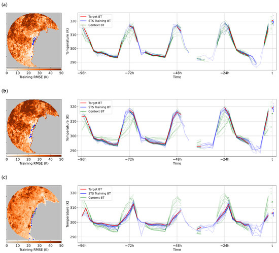 The right half of Figure 2 shows the various pixel trajectories over the STS training period. The red target value is compared to the temperature values of all pixels in the training set; however, only the pixels selected for fitting and the pixels describing the area surrounding the target are shown here. Figure 2a has the least noisy contextual temperature estimation shown here, with most disagreement between the target and the context values occurring in the middle of the day. The blue training values tend to stick closer to the target, with mild deviations mostly in the night-time period, where at times no comparison takes place. The adjacent contextual values at time t t are shown in green, whereas temperatures from the STS training group are shown in blue. In this case, the range of values seen in the contextual pixels is around 7 larger, with the contextual mean approximately 5 below the target figure. The blue STS pixels are more closely grouped, with the mean value of the STS solution far closer to the recorded value. In this case, the STS training set shares nine pixels with the contextual surrounds of the target, with the values obtained from pixels outside of this region strengthening the resulting solution.