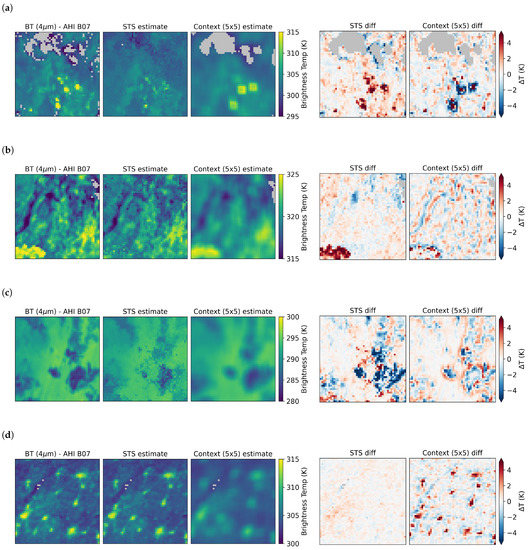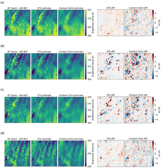 Examples of common errors in contextual brightness temperature estimation and the results using STS in similar conditions: (a) the bor_g region at 2016-052 07:50 UTC; (b) the nwa_f region at 2016-315 00:50 UTC; (c) the bor_f region at 2016-068 16:10 UTC; (d) the chn_e region at 2016-241 04:50 UTC.