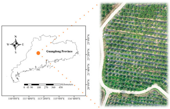 The study site is located in a citrus orchard plantation in Huangtian Town, Sihui City, Zhaoqing City, Guangdong Province, China (23°36′N, 112°68′E), as shown in Figure 1. The climatic conditions were subtropical monsoonal, with an average annual temperature of 21 °C and an annual precipitation of 1800 mm. The 110 citrus trees selected for this study were of similar age and growing in good environmental conditions in March of 2023. These citrus trees were at the stage of spring shoot growth. The management of this stage involves two aspects: promoting shoot growth and preventing pests and diseases, as well as managing the flowering of mature and young trees. Effective management at this stage is crucial for subsequent flowering and fruiting.