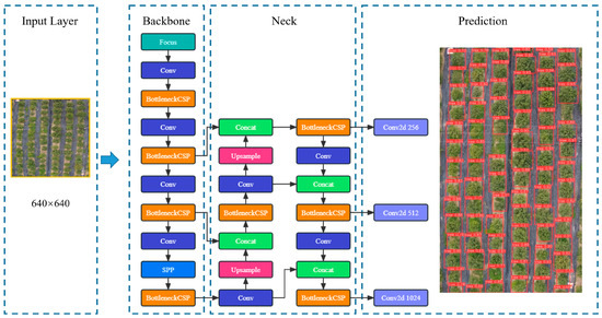 The You Only Look Once-v5s (YOLO-v5s) model [45] was used to accurately extract a single citrus tree from the UAV RGB image for target recognition. The model adopts a lightweight structure design and optimization, which can improve the detection speed while ensuring accuracy and achieving the requirement of real-time detection. The YOLO-v5s model has the advantages of high accuracy, high efficiency, and wide scalability and is an excellent target-detection algorithm with a weight size of 13.7 MB. The structural diagram is shown in Figure 3. A total of 635 images of citrus trees were used as the model training dataset, and the images were labeled with the labelImg software to label the location and category of citrus trees, with a total of 76,665 labeled boxes. The accuracy, recall, and map_0.5 of the model were 0.98, 0.98, and 0.99, respectively, which had good recognition accuracy. The recognized target citrus trees would be cropped and saved as RGB images with 3 channels of red, green, and blue, as shown in Figure 4.