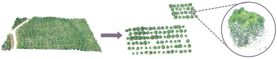 The first step was to reconstruct the 3-D model of the oblique images acquired by the UAV using Pix4Dmapper software (Pix4D Co., Prilly, Switzerland). Pix4Dmapper can convert UAV or other aerial image data into high-precision maps, models, and point cloud data and supports the input and output of multiple data formats. Import the oblique images into Pix4Dmapper, determine the datum as World Geodetic System 1984, the coordinate system as WGS 84, the camera model as FC6310R_8.8_5472×3648 (RGB), and select the “3D Models” processing option template. The 3-D reconstruction model of the citrus orchard was finally obtained after processing by the program. The point cloud data of the citrus orchard were imported into CloudCompare software, which provides powerful point cloud processing and analysis functions, including point cloud alignment, filtering, segmentation, reconstruction, analysis, and visualization operations. In the software, the citrus orchard was first cropped to remove point clouds outside the study area, which can be more convenient for manipulating the 3-D model. Next, the citrus trees were cropped to remove the ground point clouds to obtain the point cloud data of independent citrus trees. The specific process is shown in Figure 5. The citrus tree point cloud data were saved in txt file format, and each piece of point cloud data contained 6 parameter values, which were X-axis, Y-axis, Z-axis, red channel, green channel, and blue channel, as shown in Table 2.