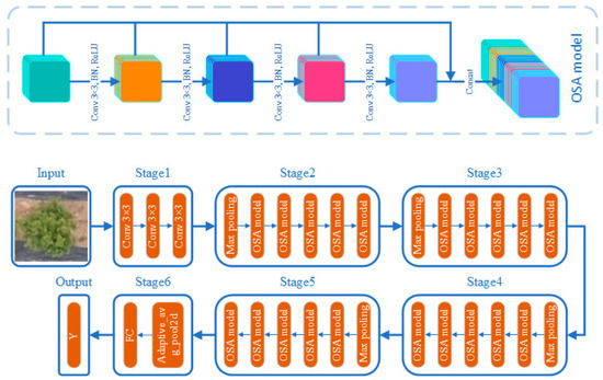 When processing RGB image data, models need to effectively capture features of different scales because RGB images contain rich color and texture information. Additionally, models need to have fast training and inference capabilities and operate efficiently in situations with limited computing resources. Therefore, VoVNet [46] is a good choice. The VoVNet is a convolutional neural network based on One-Shot Aggregation (OSA) modules, which is mainly available in three different configurations, vovnet-27-slim, vovnet-39, and vovnet-57. vovnet-27-slim was chosen for this study. The VoVNet is a Stage 1 consisting of three 3 × 3 convolutional layers, followed by a max pooling layer and four OSA modules connected to form Stages 2–5, and finally, an adaptive average pooling layer and a fully connected layer to form Stage 6. The OSA module is a modified DenseNet [47]; it only aggregates all the previous layers at once at the end, which can reduce the memory access cost and improve the GPU computational efficiency, and it can capture the multiscale receptive domain and effectively present a diverse representation of features, which is good for handling multiscale objects. Its network diagram is shown in Figure 6.