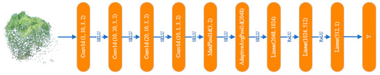 Point cloud data contain rich geometric and spatial information. To capture both local and global features of the point cloud, the model needs to incorporate one-dimensional convolutional layers for convolution operations on the data. However, due to the large quantity of point cloud data, not reducing or aggregating the data will result in a significant computational load and waste of computational resources. Therefore, PCNet was used as a model for point cloud data processing, as shown in Figure 7. The PCNet contains multiple convolutional layers, pooling layers, fully connected layers, and activation functions. Specifically, the first layer of the model is a 1-dimensional convolutional layer with 1 input channels, 10 output channels, a convolutional kernel size of 3, and a step size of 2, followed by a SELU activation function. The subsequent layers are similarly structured, where the number of input channels in each layer is the number of output channels in the previous layer. The last three layers of the model are fully connected layers, with 2048- and 1024-dimensional inputs and 1024- and 512-dimensional outputs for the first two layers, and each layer is followed by a ReLU activation function. The final fully connected layer has 512 and 1-dimensional inputs and outputs, respectively. It also includes an adaptive average pooling layer and a maximum pooling layer for extracting important information from the input features.