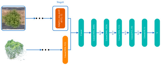UAV RGB data can provide a wealth of information about vegetation, including vegetation color, texture, and morphology. Among the acquired images of citrus trees, new leaves appear in some images, which are characterized by a more lime green color, and older leaves appear darker in comparison. In addition, the new leaves are also relatively smaller in size, and these characteristics may help to estimate the LAI. Point cloud data are composed of a large number of discrete points, each containing 3-D coordinates and color information of the vegetation. These data can be used to construct a 3-D model of the vegetation, providing additional vegetation information, such as vegetation height, density, and structure, which can be used to further optimize the LAI estimation results. However, there may be some limitations and errors in using these two types of data alone, so fusing them to estimate LAI can improve the precision and accuracy of LAI estimation. The fused use of drone RGB data and point cloud data can make full use of the data and improve data utilization, thus better supporting agricultural production. Deep-learning networks have been very successful in areas such as image recognition and regression prediction [49], and their application in LAI estimation also has great potential. Deep-learning networks can learn features and relationships automatically without the need for manual feature extraction [50], thus improving the precision and accuracy of LAI estimation. By designing a suitable deep-learning network, the generalization ability and robustness of the model can be improved, making the results of LAI estimation more reliable and accurate.