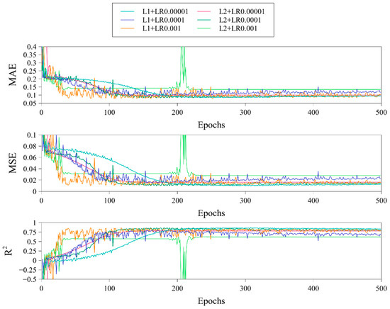 In the training process of the three models, using L1 regularization and a larger learning rate (LR0.001) leads to optimal training results with the smallest MAE and MSE values and the highest R2 value. In contrast, using L2 regularization and a smaller learning rate (LR0.00001) results in poorer training, with larger MAE and MSE and lower R2. Overall, L1 regularization is more effective than L2 regularization, which indicates that L1 regularization can effectively control the complexity of the model and avoid overfitting. This may be due to the sparsity of L1 regularization, which can select some features with weight values of 0, thus reducing the complexity of the model, as well as having stronger penalties to better suppress the growth of weights. In addition, using a larger learning rate can also obtain better results. This may be due to the fact that a larger learning rate can better capture the information in the data when the data distribution is sparse or noisy, thus improving the model’s effectiveness and enabling a better convergence rate. However, it is important to note that a larger learning rate may lead to model instability, so the choice needs to be made on a case-by-case basis.
