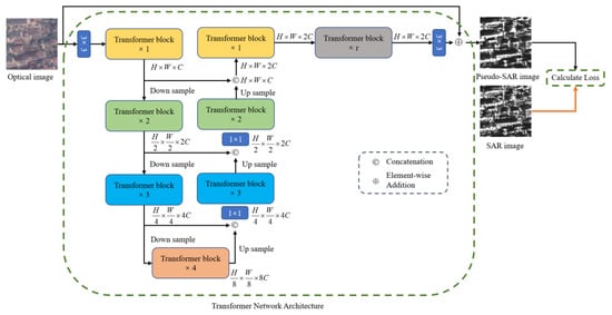 As shown in Figure 2, the input to the network is an optical image to be transformed, and the output is a pseudo-SAR image. The input image is first processed by convolution to expand the number of channels to obtain a high-dimensional feature matrix. These features are then transformed into deeper feature maps through a symmetric encoder–decoder at each level. There are a total of four levels of corresponding to the encoder and decoder blocks. Each level of encoder and decoder has multiple Transformer blocks. The number of Transformer blocks gradually increases from top to bottom, mainly for deep feature extraction. The attention mechanism establishes a connection between local and global features. The encoder uses downsampling to continuously reduce the spatial size of the input image and increase feature dimension. The decoder employs upsampling to progressively enlarge the image while compressing the feature dimensions. In order to transfer the features extracted from each downsampling layer, skip connections are added after each downsampling layer, and the feature matrix obtained by upsampling are concatenated in the channel dimension and compressed by convolution. Then, the feature matrix is further refined through several Transformer blocks and a convolution layer. To better learn the differences between the optical and SAR image features, the network introduces element-wise operation between the original optical image feature and the high-level feature matrix to help restore the lost texture and semantic details in the image. Finally, the network outputs the generated pseudo-SAR image.
