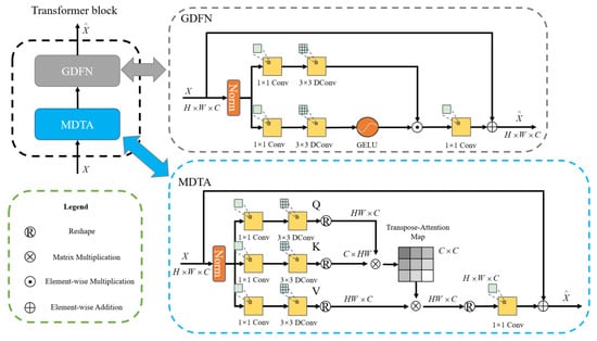 The structure of the Transformer block is shown in Figure 3, which includes two modules, MDTA [41] and GDFN. The MDTA module is Multi-Dconv Head Transposed Attention. The main network structure of this module is a self-attention mechanism. Firstly, normalize the input feature matrix, and then generate Q, K, V projections through 1 × 1 point-wise convolution and 3 × 3 depth-wise convolution, respectively. Here, Q projection is query projection, K projection is keyword projection, and V is value projection. Then, multiply the Q and K matrices to obtain the Transposed Attention Map. The Transposed Attention Map is element-wise multiplied with the V, and the resulting matrix is obtained through 1 × 1 point-wise convolution to generate the output matrix of MDTA. The principle formula is as follows:
