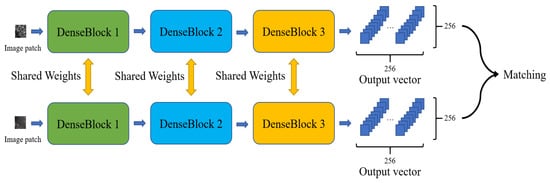 For the obtained keypoints, the image patches centered on the keypoint coordinates are selected. Then, we input the extracted image patches to the MatchosNet. The network adopts a twin structure and shares weights. The backbone of MatchosNet is CSPDenseNet [46]. The network reduces the computation and enhances the learning ability. The network structure is shown in Figure 6.