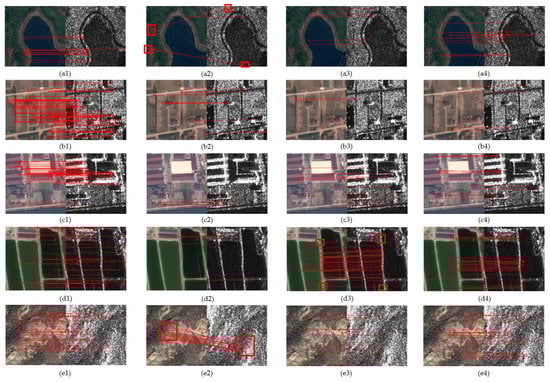 The results of pseudo-SAR generation strategies for registration and direct registration. (a1–a4) represent the forest and lake scenes, (b1–b4) represent the rural and road scenes, (c1–c4) represent the urban scenes, (d1–d4) represent the farmland scenes, and (e1–e4) represent the mountain scenes. (a1–e1) are the results of the proposed method, (a2–e2) are the results of the original Transformer + MatchosNet method, (a3–e3) are the results of CycleGAN + MatchosNet, and (a4–e4) are the results of direct MatchosNet. (a1–e3) depict the results of the two-stage registration method, showcasing the registration of the pseudo-SAR and real SAR images. (a4–e4) illustrate the results of the direct registration method, demonstrating the registration results between the optical and SAR images.