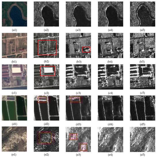 Comparison of pseudo-SAR generation strategy. (a1–a5) represent the forest and lake scenes, (b1–b5) represent the rural and road scenes, (c1–c5) represent the urban scenes, (d1–d5) represent the farmland scenes, and (e1–e5) represent the mountain scenes. (a1–e1) are the real optical images, (a2–e2) are pseudo-SAR images generated by CycleGAN, (a3–e3) are pseudo-SAR images generated by original Transformer, (a4–e4) are pseudo-SAR images generated by improved Restormer, and (a5–e5) are the real SAR images.