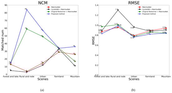 Comparison of different pseudo-SAR generation strategies for registration and direct registration. (a) represents NCM statistics. Among them, there are 4 curves, representing direct registration MatchosNet, CycleGAN + MatchosNet, original Restormer + MatchosNet, and the proposed method. (b) represents the RMSE statistics. Among them, there are 4 curves, representing direct registration MatchosNet, CycleGAN + MatchosNet, original Restormer + MatchosNet, and proposed method.