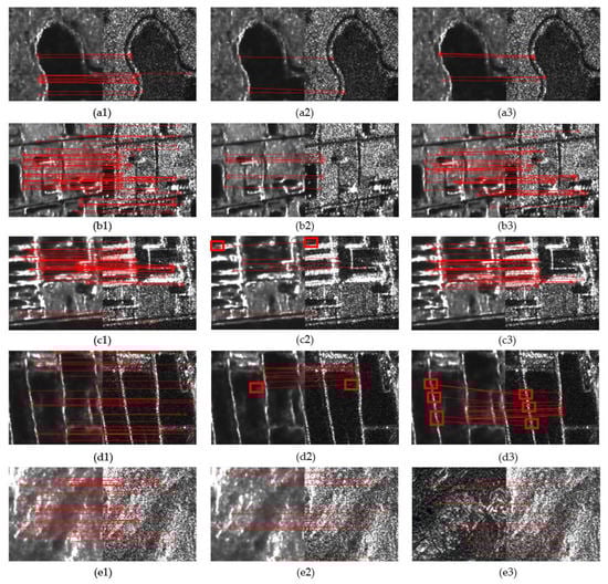 Figure 14 presents the comparison of keypoint extraction strategies for pseudo-SAR and real SAR images. It can be observed that the proposed strategy yields a higher number of keypoint matches without any matching errors. However, the DoG and FAST extraction strategies exhibit fewer matching points. Especially in some scenarios there are some erroneous keypoint matches, as indicated by the red boxes in Figure 14(c2,d2,d3).