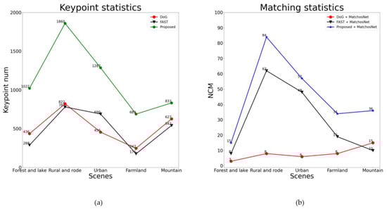 In Figure 15, a comparison of three keypoint extraction methods is presented. In Figure 15a, the number of keypoints extracted by the three methods is compared. Figure 15b illustrates the NCM for the three methods. It can be observed that proposed keypoint extraction strategy outperforms the other methods in terms of both the number of keypoints selected and the final NCM. FAST operator extracts fewer keypoints than DoG in most cases but more keypoints than DoG in urban areas, which fully shows that there are more corners in urban areas and FAST is easier to extract keypoints than DoG. However, in weak texture areas, the corner feature is not significant, so FAST extracts fewer keypoints. The proposed keypoint extraction strategy gives consideration to both shallow and deep features, it can extract large keypoints in both weak and strong texture regions, and the final matching keypoints are more than FAST and DoG. This provides substantial evidence for the robustness of our keypoint extraction strategy.