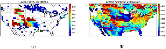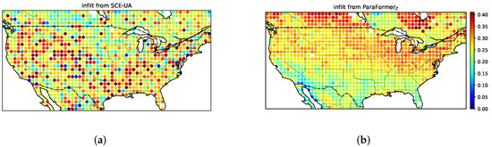 Compared with SCE-UA (Figure 5b), DL-based parameter calibration methods (Figure 5c,d) provide better spatial generalization, showing continuity and stronger constraints in the calibrated parameters. For instance, in the vicinity of Michigan, similar terrain, climate, and soil characteristics suggest that the parameters will not vary significantly, and both LSTM and ParaFormer show good spatial consistency. However, on the one hand, across the entire CONUS, the parameters range calibrated by LSTM is approximately [0, 0.105], while those calibrated by NLDAS-2 and SCE-UA are [0, 0.3] and [0, 0.41], respectively. The parameters range of ParaFormer is [0, 0.35], which is evidently closer to the reference range than LSTM. On the other hand, precipitation decreases from east to west until it reaches the Rocky Mountains. The high humidity in the Midwest Plains, Great Lakes region, and the central and northern parts of the United States results in a higher value of parameter , while the dry climate and higher temperature in the southern and southwestern regions of the United States lead to a lower value of parameter . The parameters calibrated by ParaFormer better conform to these climatic characteristics. Finally, in comparison with the regions where the parameter values are higher and lower in NLDAS-2, the ParaFormer calibrated parameters are more consistent, such as in the vicinity of the Great Lakes region in the United States, where ParaFormer may performs better than LSTM.