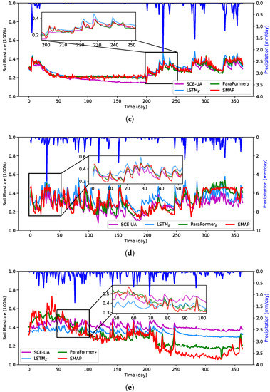 We evaluated SM predictions for three randomly selected sites, as indicated in Figure 8a (or Figure 8b), which are located in different climatic conditions. Figure 8c–e present the calibrated SM predictions of SCE-UA, LSTM, and ParaFormer compared to SMAP observations over a one-year testing period. Furthermore, for each site, we compared the calibrated predictions during a period of heavy rainfall to assess the models’ performance in intense precipitation events. The results demonstrate that ParaFormer exhibits superior overall performance in calibrated SM prediction compared to SCE-UA and LSTM, with smaller prediction errors during rainfall events.