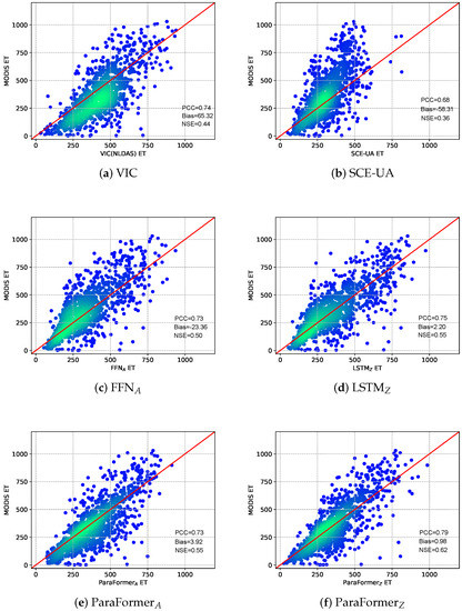 Uncalibrated variable (ET) metrics from models trained on the DAS-S8 dataset. Scatterplots of temporal-mean ET (mm/year) comparing the MODIS product with ET produced by (a) VIC(NLDAS-2), (b) SCE-UA, (c) FFN, (d) LSTM, (e) ParaFormer, and (f) ParaFormer. Green color indicates higher density of points.