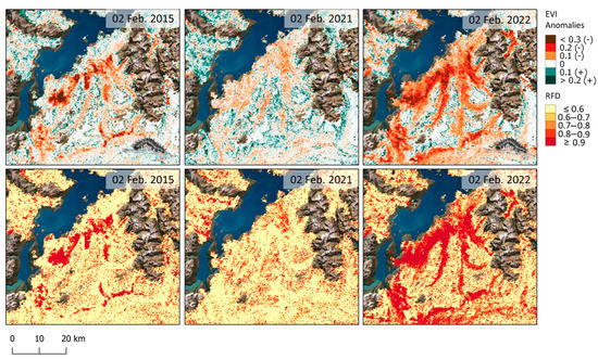 Figure 3 provides examples of the anomaly maps (upper panels) and RFD maps (lower panels) for three specific dates: 2 February2015, at the peak of the 2014–2015 GS (summer), which is the outbreak already reported by Gutiérrez et al. [1]; 2 February 2021, at the peak of the 2020–2021 GS to show a year with no outbreak; and 2 February2022, at the peak of the 2021–2022 GS, when the last massive outbreak in Mallín Grande took place. The RFD maps for 2015 and 2022 show the severe defoliation from Ormiscodes amphimone leaving a trace of a continuous area with EVI records outside 0.90 RFD.