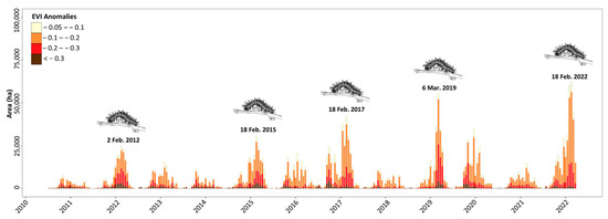 Area of N. pumilio forest showing extreme negative EVI anomalies (RFD ≥ 0.90) derived from MODIS Terra between 2010 and 2022. Each bar corresponds to a date (with a 16−day time interval) and the different colors of the bars represent the magnitude of the EVI anomalies.