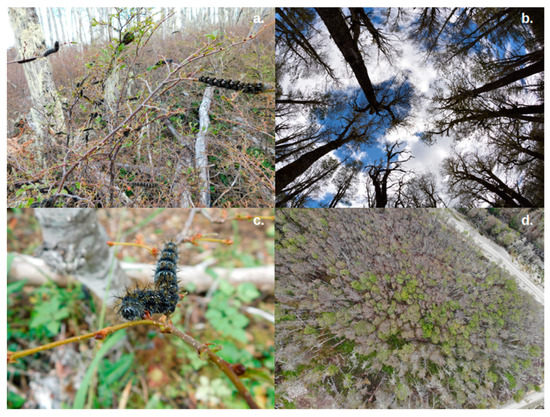 Field photographs of the O. amphimone outbreak of 2019 in a highly defoliated area of N. pumilio forest in Mallín Grande, Southern Chile: (a,c) show caterpillars feeding on N. pumilio leaves; (b) hemispherical photo; and (d) drone photo showing a highly defoliated N. pumilio stand.