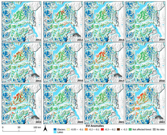 All outbreak events have broken the previous record for maximum defoliated area (i.e., extreme negative EVI anomalies with RFD ≥ 0.90): 2012 reached 25,063 ha, 2015 30,837 ha, 2017 42,512 ha, 2019 55,193 ha and finally the summer of 2022 reached the maximum area of 62,344 ha (Figure 4). Although 2022 showed the maximum extent of negative EVI anomalies, in terms of EVI anomaly intensity, 2019 showed the largest area with negative anomalies at higher EVI anomaly magnitudes: a total area of 25,694 ha below -0.2 EVI (red and dark red together in Figure 4). From Figure 4, it is possible to observe a residual effect during the GS coming right after the outbreaks, when a relevant area still shows extreme negative EVI anomalies, but less than the GS of the outbreak itself, showing a certain degree of forest canopy recovery. This is an indication that, so far, the outbreaks have not killed, at least massively, the forest.