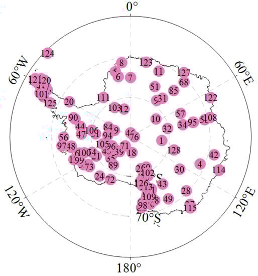 In addition, the 109 automatic weather stations and 19 manual stations are used to explore whether the MODIS data can reflect the temperature change over Antarctica, and the data we used in this study cover at least 5 years. The automatic weather stations’ data are from the AntAWS dataset, which is a compilation of Antarctic automatic weather station observations that have undergone quality control [45], and the data can be downloaded at https://amrdcdata.ssec.wisc.edu/dataset/antaws-dataset (accessed on 10 May 2023). The manual data are from the project called the Reference Antarctic Data for Environmental Research that is undertaken by the Scientific Committee on Antarctic Research, which can be downloaded at https://legacy.bas.ac.uk/met/READER/surface (accessed on 10 May 2023). Locations of the 128 stations are shown in Figure 2, and the detailed information can be found in Table S1.