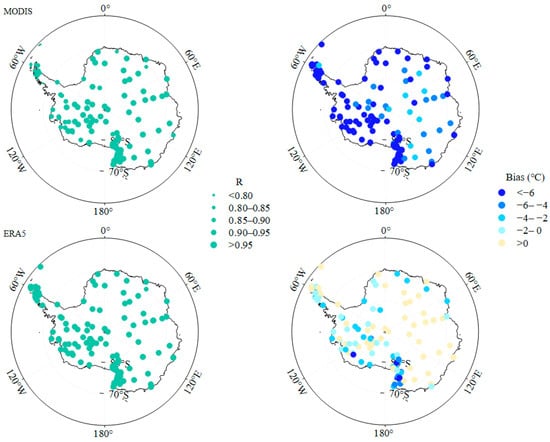 Satellite remote sensing data provide an unprecedented high spatial resolution and wide coverage data, such as surface temperature, which can be regarded as reliable data when observation data are scarce or the measured data are insufficient to meet the research needs [40,41,42]. The MODIS (Moderate Resolution Imaging Spectroradiometer) in the Aqua and Terra satellites has a large spectral range, which enables the sensor to simultaneously collect information about atmosphere, land, ice and water properties, and is widely used in a variety of studies [43]. The MODIS is of high practical value for the comprehensive study of earth science and the classification of land, atmosphere and oceans. Research has found that the MODIS data can reflect the surface temperature in Antarctica, with the mean bias range from −1.8 °C to 0.1 °C, and the root-mean-square errors lower than 4.88 °C in the Antarctic plateau [44].