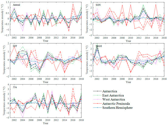 To examine the inter annual variations, we calculate the annual and seasonal temperature anomalies based on MODIS observations and ERA5 (relative to their 2001–2018 mean) in the Southern Hemisphere and Antarctica, and the three sub regions of East Antarctica, West Antarctica and the Antarctic Peninsula, and the results are shown in Figure 5. Clearly, the changes in regional temperature reflected by the MODIS and ERA5 are similar, and the temperature mean in the Antarctic Peninsula exhibits a more severe fluctuation relative to the other regions on all annual and seasonal scales. In addition, the temperature changes in Antarctica show a similar variation to that of the land region in the Southern Hemisphere. The significant correlation coefficient between annual temperature anomalies in Antarctica and the Southern Hemisphere is 0.96 (0.98) from the MODIS (ERA5), the correlation coefficient between East Antarctica and the Southern Hemisphere is 0.96 (0.94), and the corresponding value between West Antarctica and the Southern Hemisphere is 0.80 (0.79). However, the temperature anomaly of the Antarctic Peninsula from ERA5 shows a negative correlation with that of the Southern Hemisphere, with a correlation coefficient of −0.31, whereas the anomaly from the MODIS shows a near zero R (0.08).