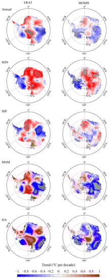 The distribution of temperature trend (°C per decade) over Antarctica for annual, austral spring (SON, September–November), summer (DJF, December–February), autumn (MAM, March–May) and winter (JJA, June–August) mean from ERA5 (left panel) and MODIS land surface temperatures (right panel), respectively. The gray shaded areas with trends significant at the 95% confidence level.