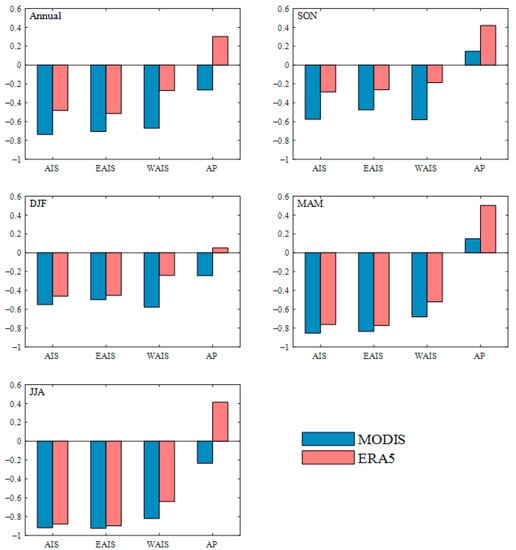 The Southern Annular Mode is critical to temperature change over Antarctica, which reflects the opposite phases change of pressure and geopotential height between mid-latitudes and high latitudes in the Southern Hemisphere [8]. Here, we use the observed annual and seasonal Southern Annular Mode indices (available at https://legacy.bas.ac.uk/met/gjma/sam.html (accessed on 12 November 2022)) to calculate the correlation coefficients between the regional average temperature and Southern Annular Mode during the period 2001–2018. Generally, the correlation between temperature and the Southern Annular Mode is greater in the MODIS compared with ERA5 except for the Antarctic Peninsula (Figure 8). For Antarctica, the annual and seasonal temperatures show the negative correlations, with the annual R of −0.48 and −0.73 from ERA5 and MODIS observations, respectively. The negative correlation is greatest in austral winter, and the correlation coefficients are −0.88 and −0.92 from ERA5 and the MODIS, respectively. The winter temperature in East Antarctica is greatly affected by the Southern Annular Mode, with the correlation coefficients of −0.90 and −0.93 from ERA5 and the MODIS, respectively. Different from the consistent signals of ERA5 and the MODIS in Antarctica, East Antarctica and West Antarctica, the opposite signal in the Antarctic Peninsula can be observed in annual, autumn and winter, and the correlation is positive in ERA5 while negative in MODIS observations. The positive correlations between the Southern Annular Mode and surface temperature in the Antarctic Peninsula also can be observed in a reconstruction that is based on observations and MODIS observations [53]. From the beginning of the 21st century, the annual mean temperature in the Antarctic Peninsula shows a downward trend, with the most conspicuous cooling in austral summer. In this period, the mid-latitude jet strengthens, and induces the increase of cyclonic conditions in the northern Weddell Sea, which can increase the frequency of cold east-to-southeasterly winds to blow toward the Antarctic Peninsula and lead to sea ice towards the east coast of the Antarctic Peninsula [12]. These changes impede the warm northwesterly air related to the Southern Annular Mode entering the interior of the Antarctic Peninsula.