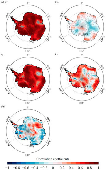 The distribution of annual correlation coefficients between the following variables—surface downward longwave radiation (sdlr), total column ozone (tco), specific-humidity at 850 hPa (q), total cloud cover (tcc) and cloud base height (cbh)—and the temperature over Antarctica. The gray stippling shows the regions that fail to pass the 95% significant confidence test.