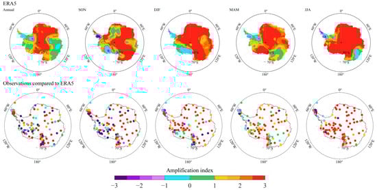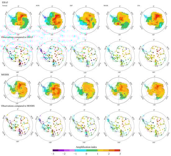 Spatial patterns of amplification index over Antarctica for annual, austral spring (SON, September–November), summer (DJF, December–February), autumn (MAM, March–May) and winter (JJA, June–August) mean from ERA5 and the MODIS, and the amplification index from 128 stations compared with ERA5 and the MODIS, respectively.