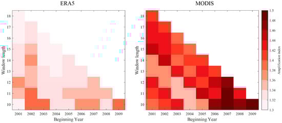 To analyze the ability of the MODIS to retrieve AnA using limited data, Figure 11 shows the annual AnA index with differing start years and interval lengths from ERA5 and MODIS observations. Clearly, the AnA always occurs, and the intensity of AnA from the MODIS is stronger than that from ERA5, with the difference of the AnA index between them lower than 0.2. The MODIS illustrates that the greatest AnA appears in the period 2009–2018, with the amplification index of 1.49, and the strong AnA also can be captured in ERA5, with the index of 1.40.