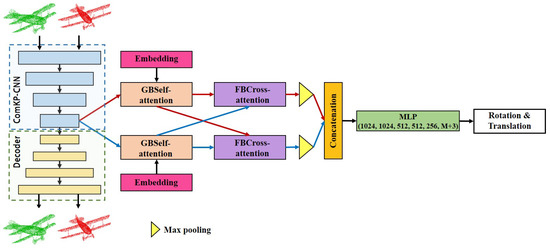 GBSelf-attention embeds the coordinate information as transformation-variant and the distance information as transformation-invariant into each individual point cloud so that the features can explicitly capture the geometric structure information. FBCors-attention enables two point clouds to perceive each other’s features so that the geometric consistency of the overlapping part can be transmitted interactively between the two point clouds. Finally, symmetric function max pooling is used to capture the global features and and stacks and in the channel dimension to obtain . The process is as follows: