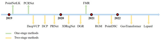 At present, most research adopts two-stage methods to estimate the transformation matrix, as shown in Figure 2 and Table 1. In the first stage, the correspondences between the source and template are predicted, such as the corresponding relationship of key points, the corresponding relationship of feature points and the corresponding relationship of all points. In the second stage, the transformation matrix is estimated according to the correspondences. In this stage, Singular Value Decomposition (SVD) [19], Random Sample Consensus (RANSAC) [24] or Artificial Neural Networks (ANNs) [25] are usually used to estimate the transformation matrix.