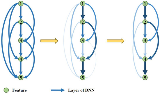 The DNN design method proposed in this paper includes three steps, as shown in Figure 5. First, the existing network designed by researchers is selected as the backbone, and the network is extended to a global coupling network. Then, the network is trained to obtain each edge weight. If the edge weight is small, the edge is considered to play a small role in extracting features, so the edge is deleted. Then, the network is retrained to obtain a complex network with a small-world effect. Based on complex network theory, this method can design a DNN with excellent performance and can better extract the input data features. This design can be used not only in the design of point cloud feature extraction networks but also in the design of feature extraction networks for images, text, voice and other types of data.