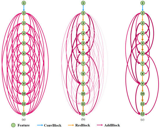 KP-CNN constructs a simple chain network with features as nodes and feature extraction layers as edges. In this paper, (AddBlock) is used as the added edge to build a global coupling network, which is called the global coupling KP-CNN, as shown in Figure 6a. Then, we train the network, remove the edges with small weights and retrain the network to obtain a complex network with a small-world effect, called ComKP-CNN, as shown in Figure 6c.