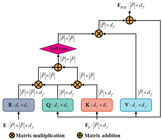 Global context has proven critical in many computer vision tasks [28,45,46]. Since our model estimates the transformation matrix through the global features of the point cloud, rather than through the correspondences, the model needs to obtain the transformation-variant information of the point cloud. Therefore, the point coordinates are explicitly embedded into the features so that the features have transformation-variant characteristics. Additionally, the geometric features of the overlapping part of the source point cloud and template point cloud have geometric consistency, so we explicitly embed the distance information between points with transformation invariance into the features. Inspired by nonlocal neural networks, we design a geometric GBSelf-attention, as shown in Figure 8, to learn the global correlations in both feature and geometric spaces among the downsampled points for each point cloud. We describe the computation for downsampled points , and the same goes for . The feature of is taken as the input feature of GBSelf-attention and the output feature , and the same goes for . The feature of can be computed by