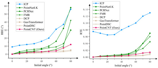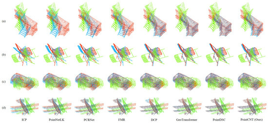 ModelNet40 [50] contains 3D CAD models from 40 categories. It is a widely used dataset for training 3D deep learning networks. We split ModelNet40 into two parts, each of which contains 20 point cloud categories. One part is split into a training set and a testing set according to the proportion of 8:2 to perform same-category testing. The other part is used to perform cross-category testing. ModelNet40 is a simulation dataset with similar characteristics to industrial products. This paper conducts experiments on the ModelNet40 dataset because point cloud registration has been applied to industrial product quality inspection. To verify the effectiveness of our model, we also conduct experiments on the 3DMatch dataset and KITTI dataset. 3DMatch [51] contains 62 scenes, among which 46 are used for training, 8 for validation and 8 for testing. KITTI contains point clouds captured with a Velodyne HDL64 LiDAR in Karlsruhe, Germany, together with the “ground truth” poses provided by a high-end GNSS/INS integrated navigation system. KITTI [52] contains point clouds captured with a Velodyne HDL64 LiDAR in Karlsruhe, Germany, together with the “ground truth” poses provided by a high-end GNSS/INS integrated navigation system.