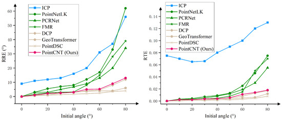 Point cloud registration is divided into coarse registration and fine registration. Typical coarse registration algorithms include the Point Feature Histogram (PFH) [13], Fast Point Feature Histogram (FPFH) [14], 3D Shape Context (3Dsc) [15], Normal Distributions Transform (NDT) [16], 4-Points Congruent Sets (4PCS) [17] and Principal Component Analysis (PCA) [18]. The coarse registration algorithm is not sensitive to the initial pose, but its registration accuracy is low. The coarse registration can be considered a preprocessing process for point cloud initialization in fine registration. Iterative Closest Point (ICP) and its variants [19,20,21,22] are the best-known traditional fine registration algorithms. ICP alternates between finding point cloud correspondences and solving a least-squares problem to update the alignment. However, ICP-style methods are prone to local minima due to nonconvexity. To solve the above problem, a Globally Optimal Solution to 3D ICP Point-set Registration (Go-ICP) [23] uses a branch-and-bound method to search the motion space. Go-ICP outperforms local ICP methods when a global solution is desired but is several orders of magnitude slower than other ICP variants. Traditional methods do not require a large quantity of training data and have excellent generalization ability. However, they are usually sensitive to noise, have difficulty processing partially overlapping point clouds, easily converge to local optimal solutions, have low registration accuracy and have long computational times. Unlike traditional registration methods, PointCNT based on deep learning is an end-to-end algorithm. It is insensitive to noise and can process partial overlap problems with high computational efficiency and registration accuracy.