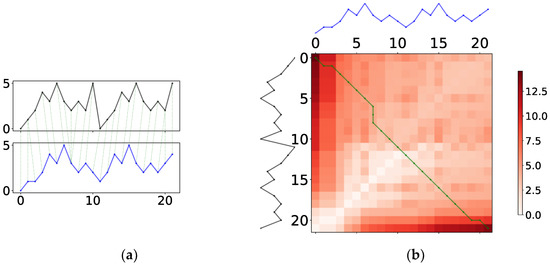 Given the above steps of time series processing, an execution example of the DTW process is shown in Figure 1. Figure 1a illustrates the corresponding data points of the two measured time series (black and blue lines). As shown in the figure, the green dashed lines that connect the aligned data points among two time series. Figure 1b shows the heat map and the shortest path of the DTW result. The lighter color of each grid in the heat map indicates the smaller DTW distance between the two corresponding data points. The green line indicates the shortest path between two time series measured by the DTW algorithm. The DTW algorithm provides the basis for proposing a loss function for measuring among multivariate time series in the present work.